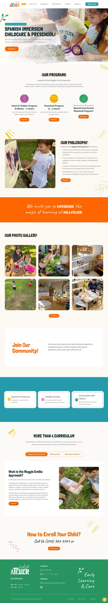 • Hola Atelier is a Spanish immersion childcare and preschool program located in Rockville, Maryland. They serve children ages 8 weeks to 5 years old using an educational approach inspired by Reggio Emilia methodology, combining immersive Spanish language learning with play-based, child-centered pedagogy.